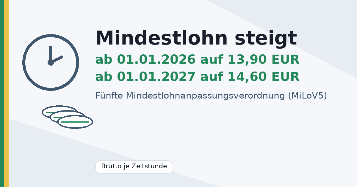 Mindestlohn steigt: 13,90 EUR ab 2026 und 14,60 EUR ab 2027
